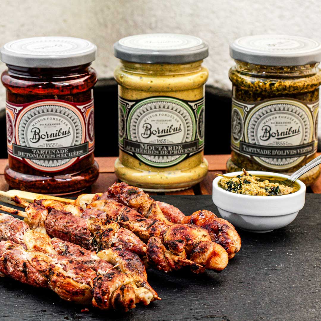 Serve the marinated lamb and apricot brochettes hot, with Bornibus green pepper mustard for dipping.
