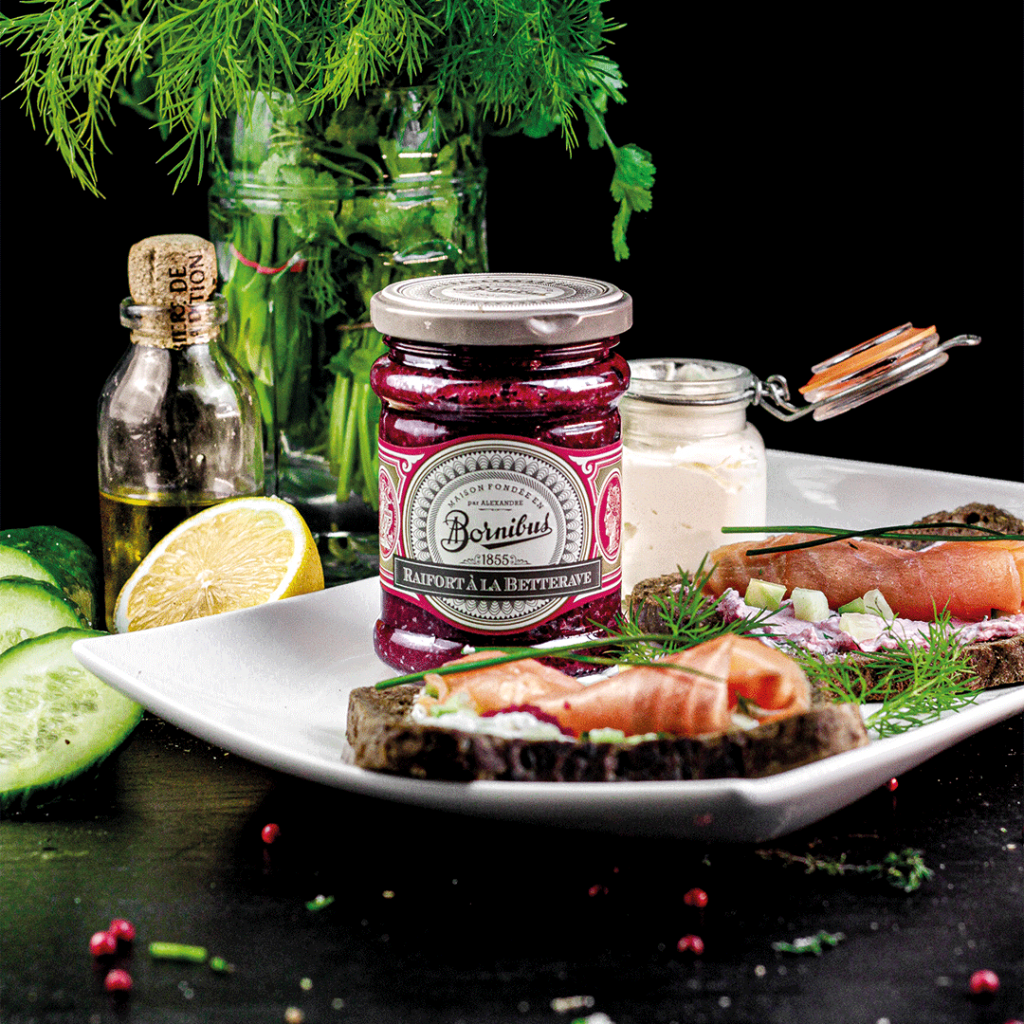 Verrine de saumon au raifort à la betterave et à la julienne de betterave