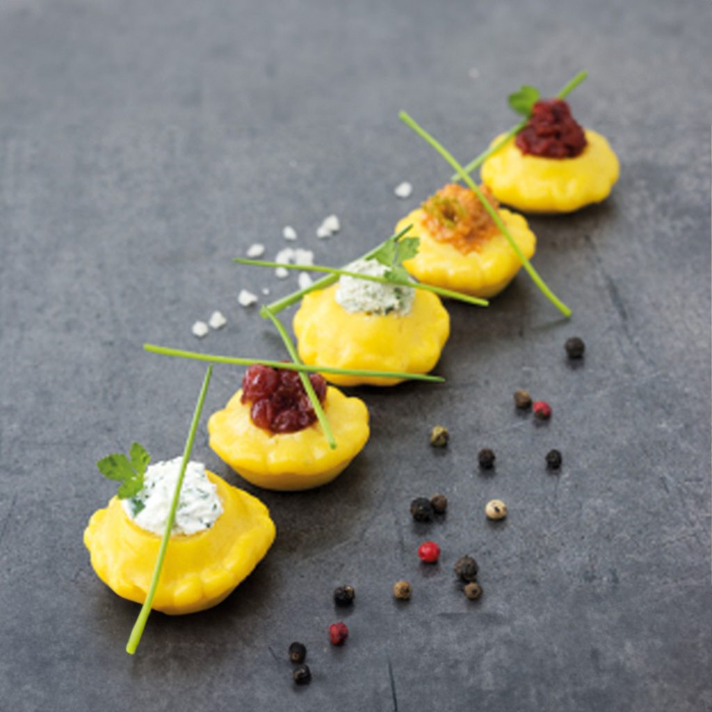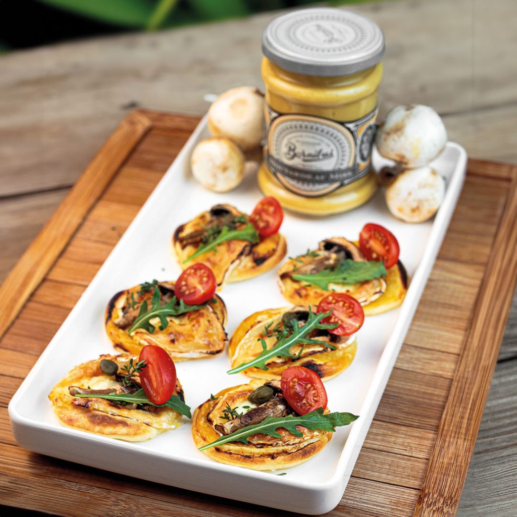 Mini tartelettes au chèvre, champignon, câpres et moutarde au miel