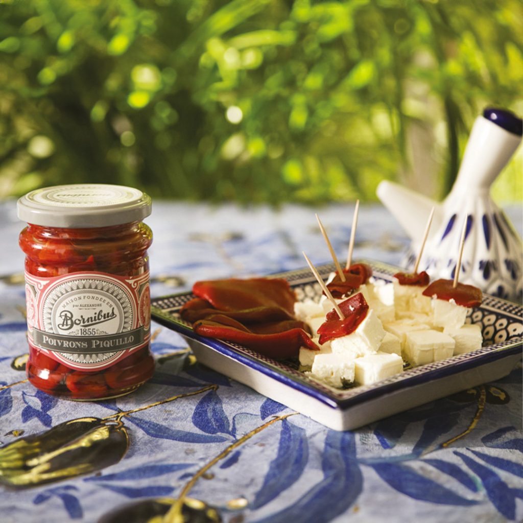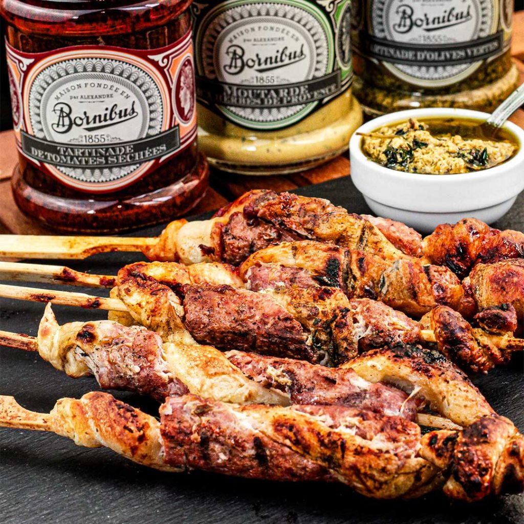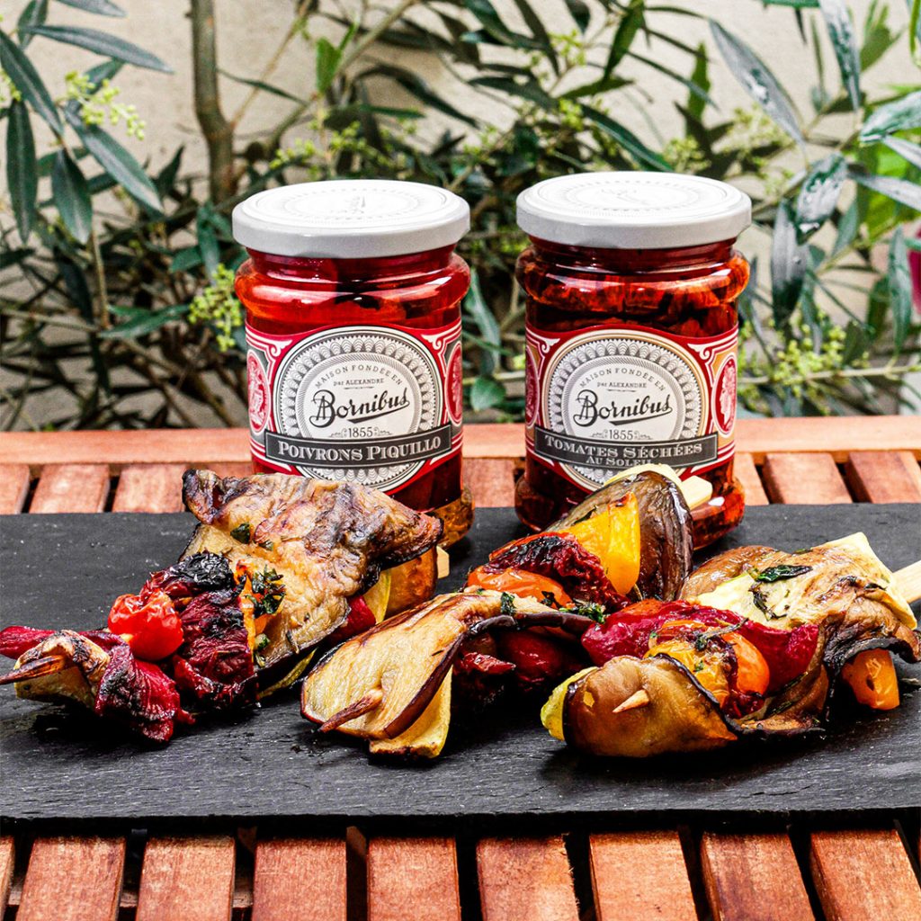 Mini brochettes de mozzarella, tomates cerises, ail doux et ail pimenté Bornibus :