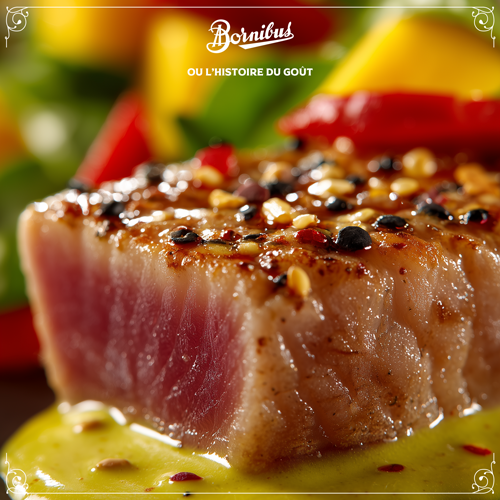 Ton mi-cuit à la réunionnaise sur son lit de moutarde au poivre vert :